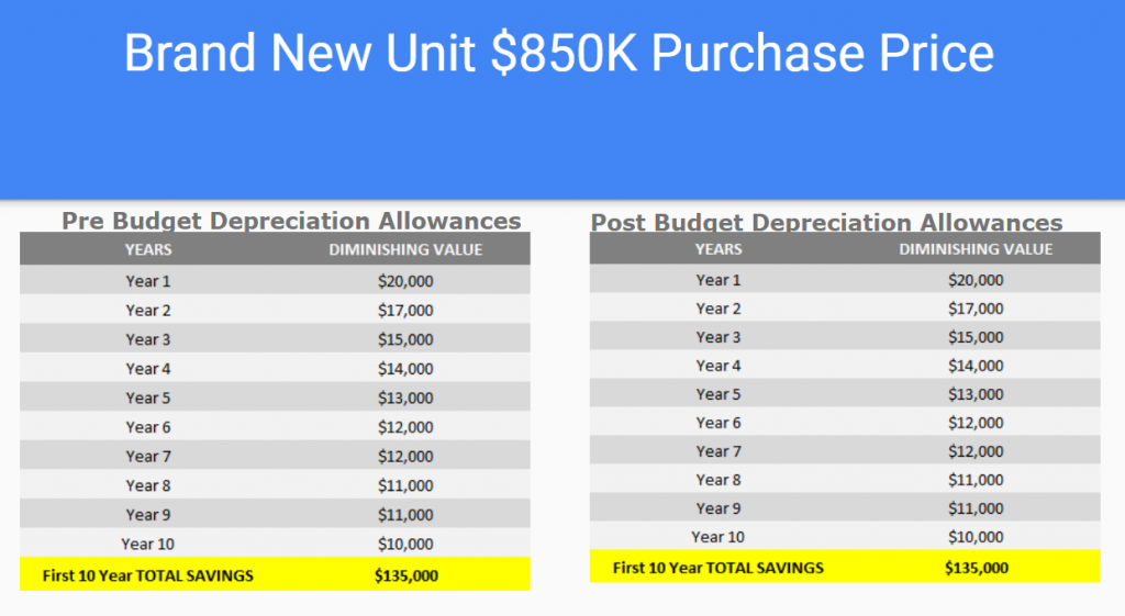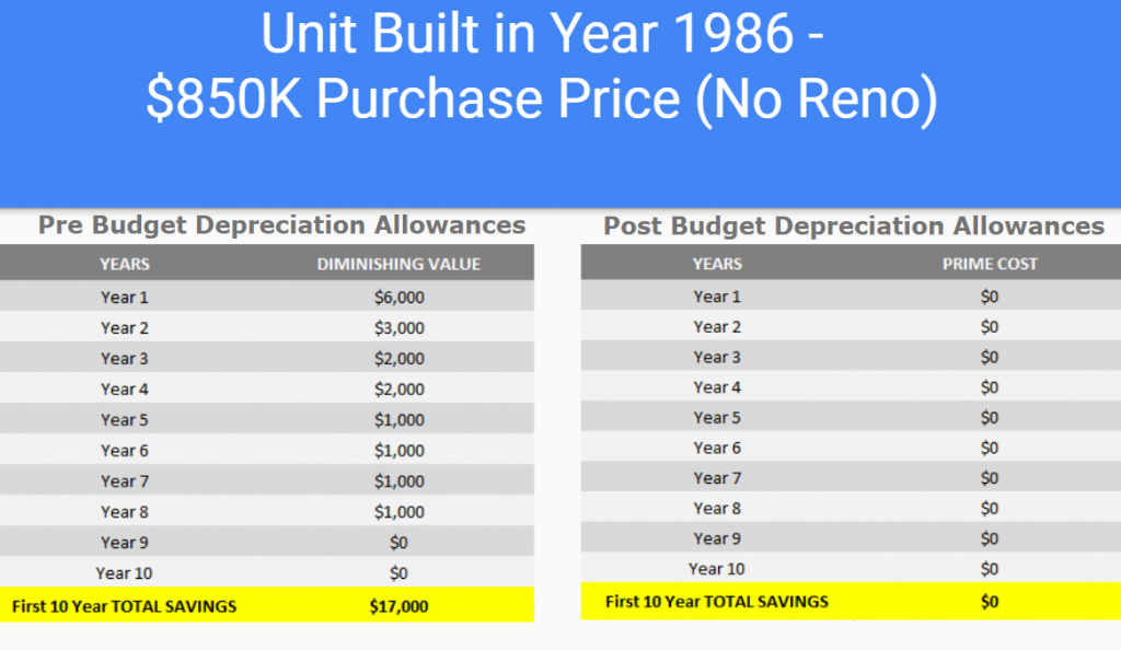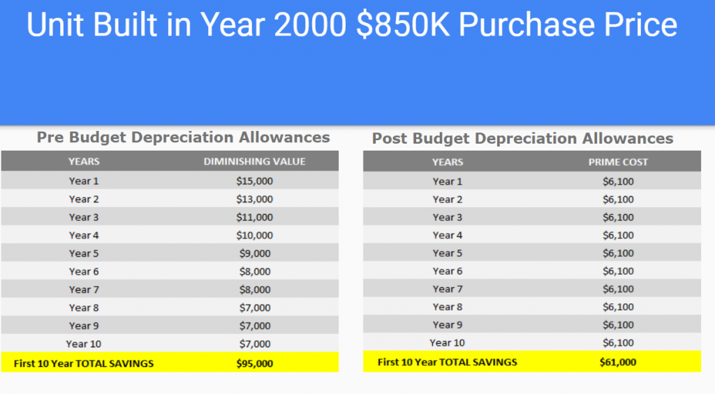 As you can see from the above chart the depreciation amount you can claim if you bought the same property pre-budget or post-budget hasn’t changed.